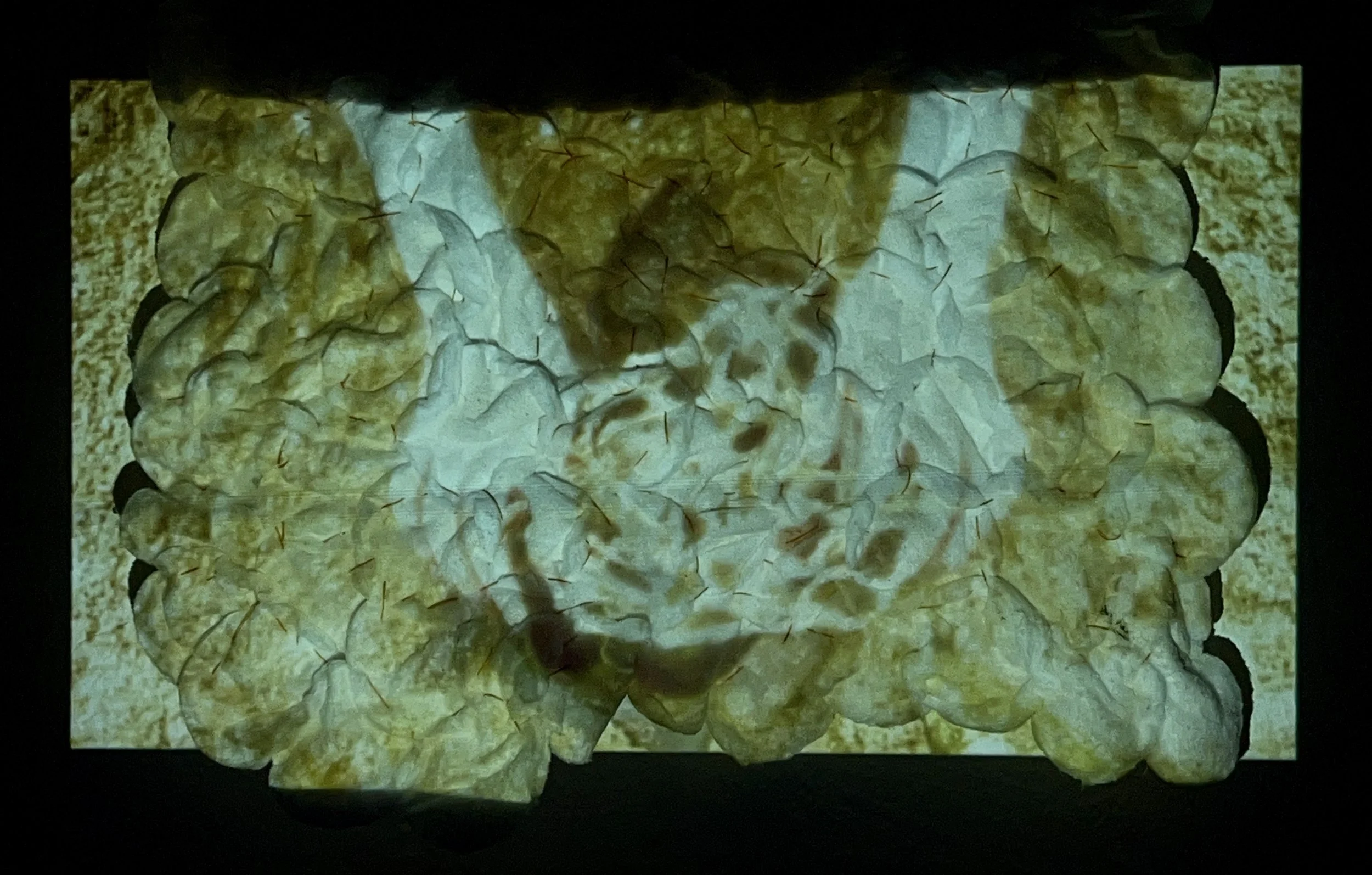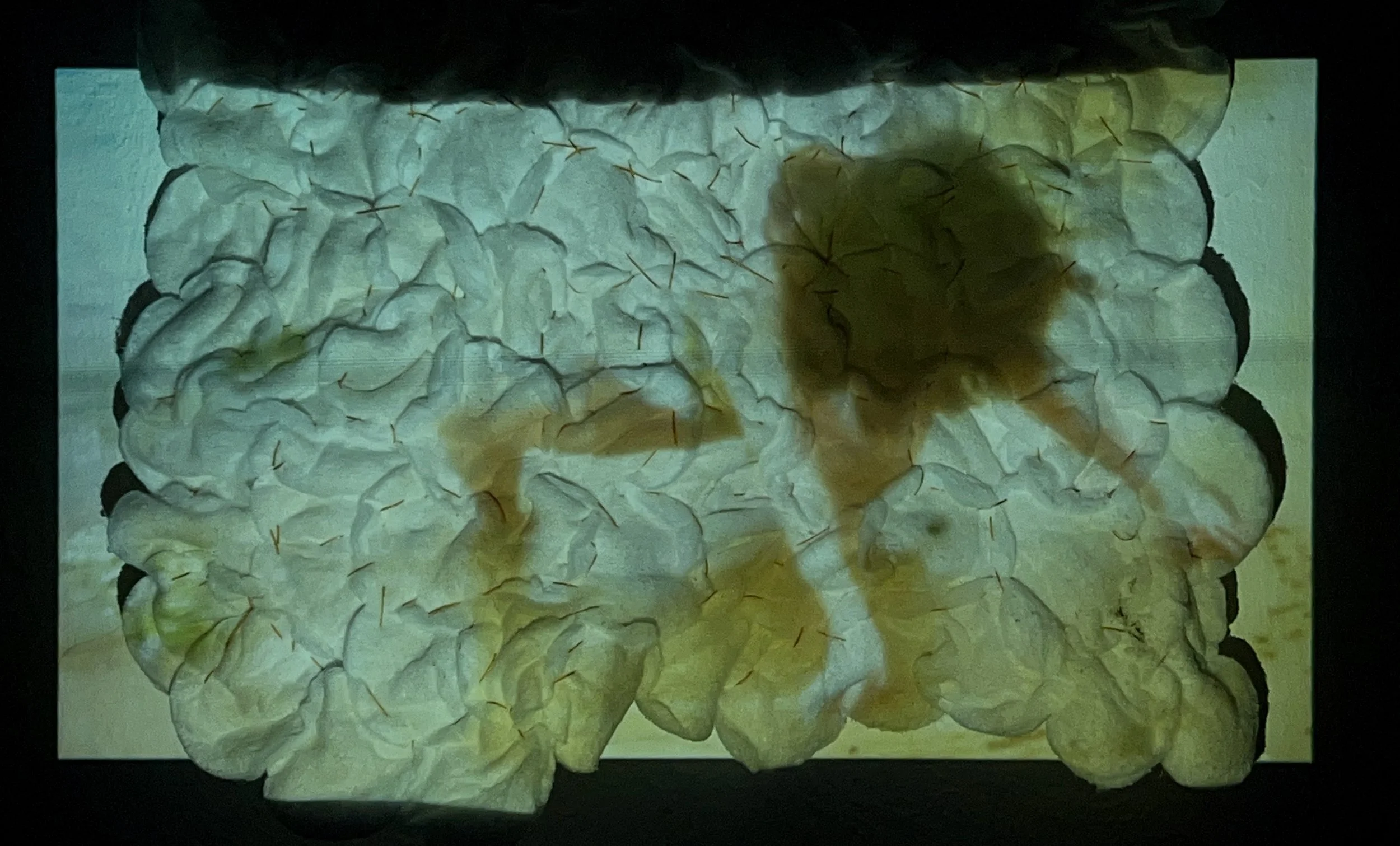 Making a Nest (projections), Projections of 'Making a Nest' video performance on stitched together cotton pads, 2023