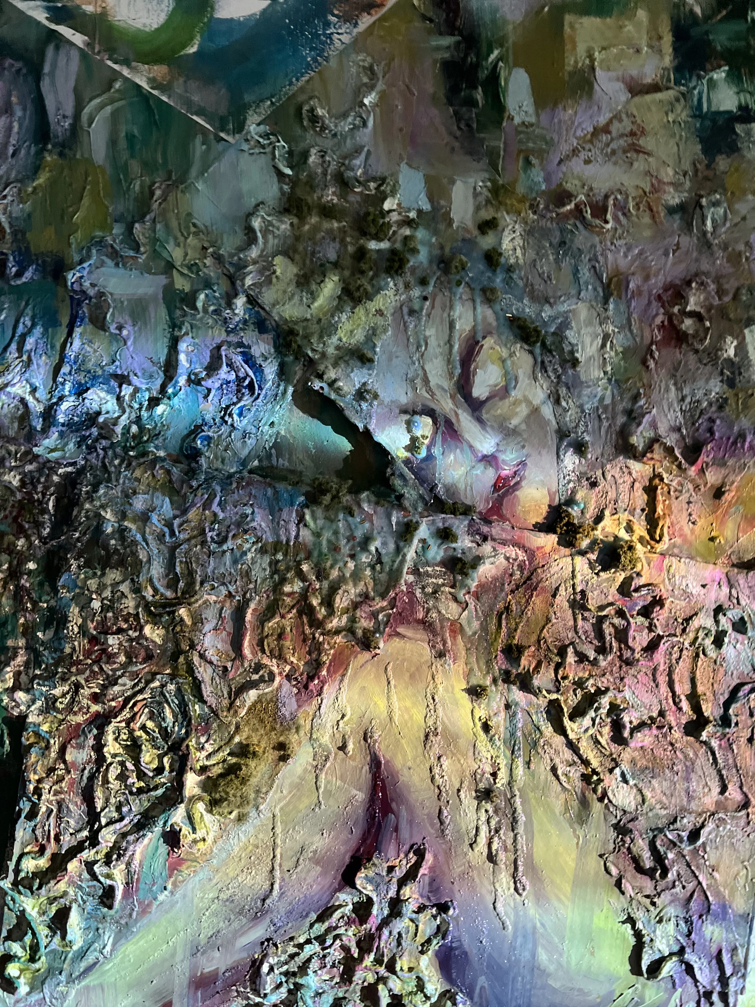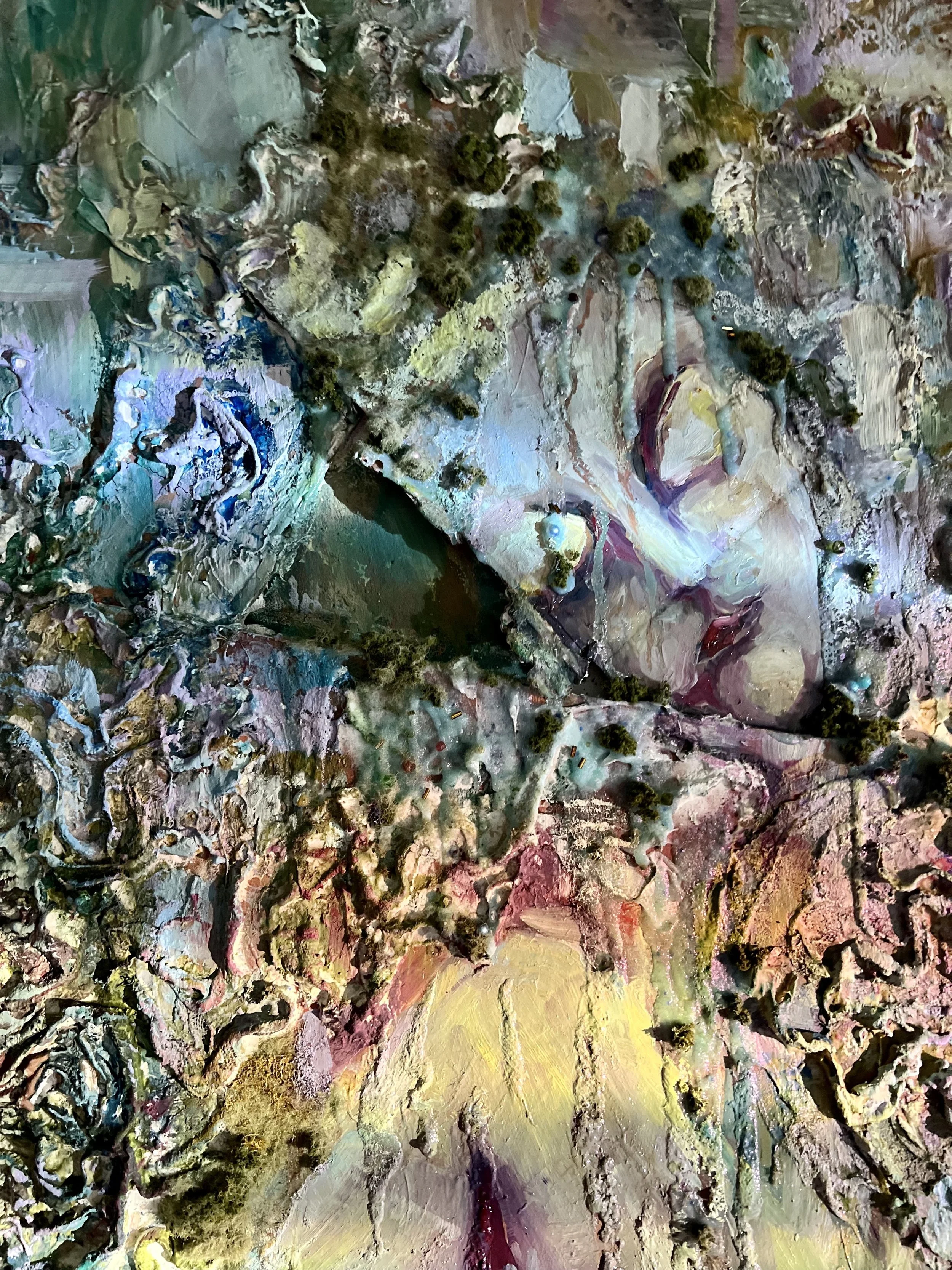 There's a Forest Under the Ocean Shore (close up), 120x115cm, Oil, mod roc plaster and artificial grass on cardboard, 2022