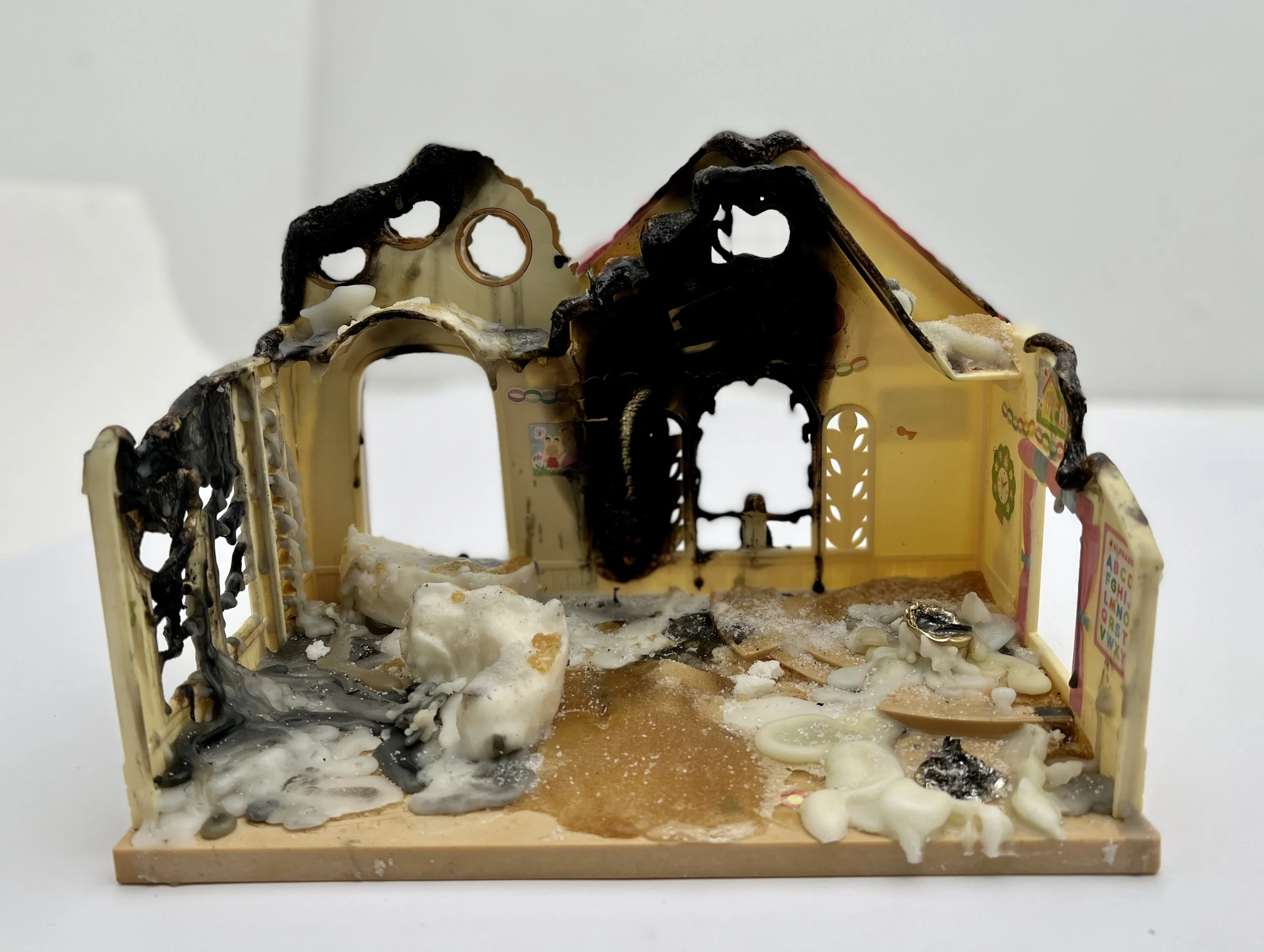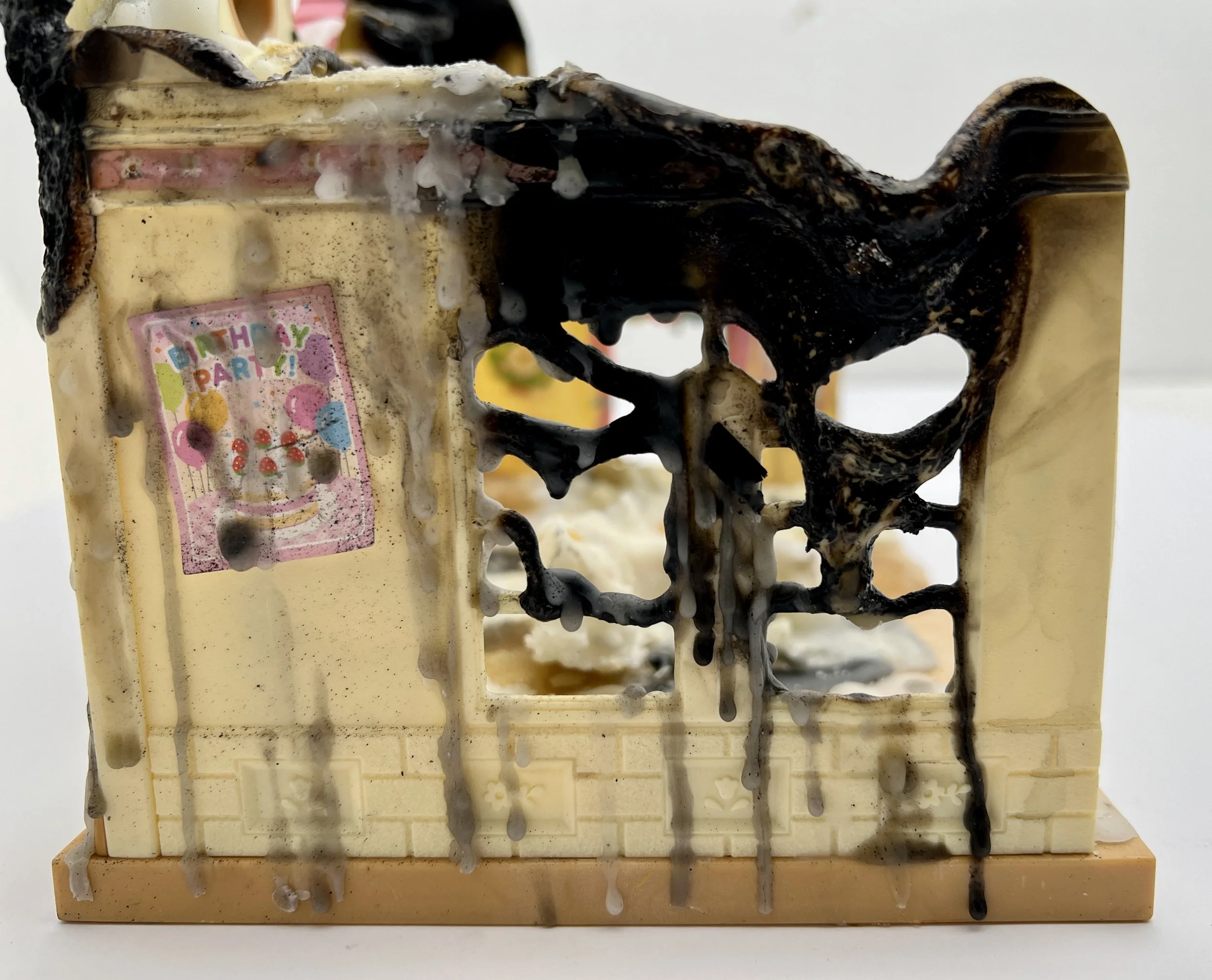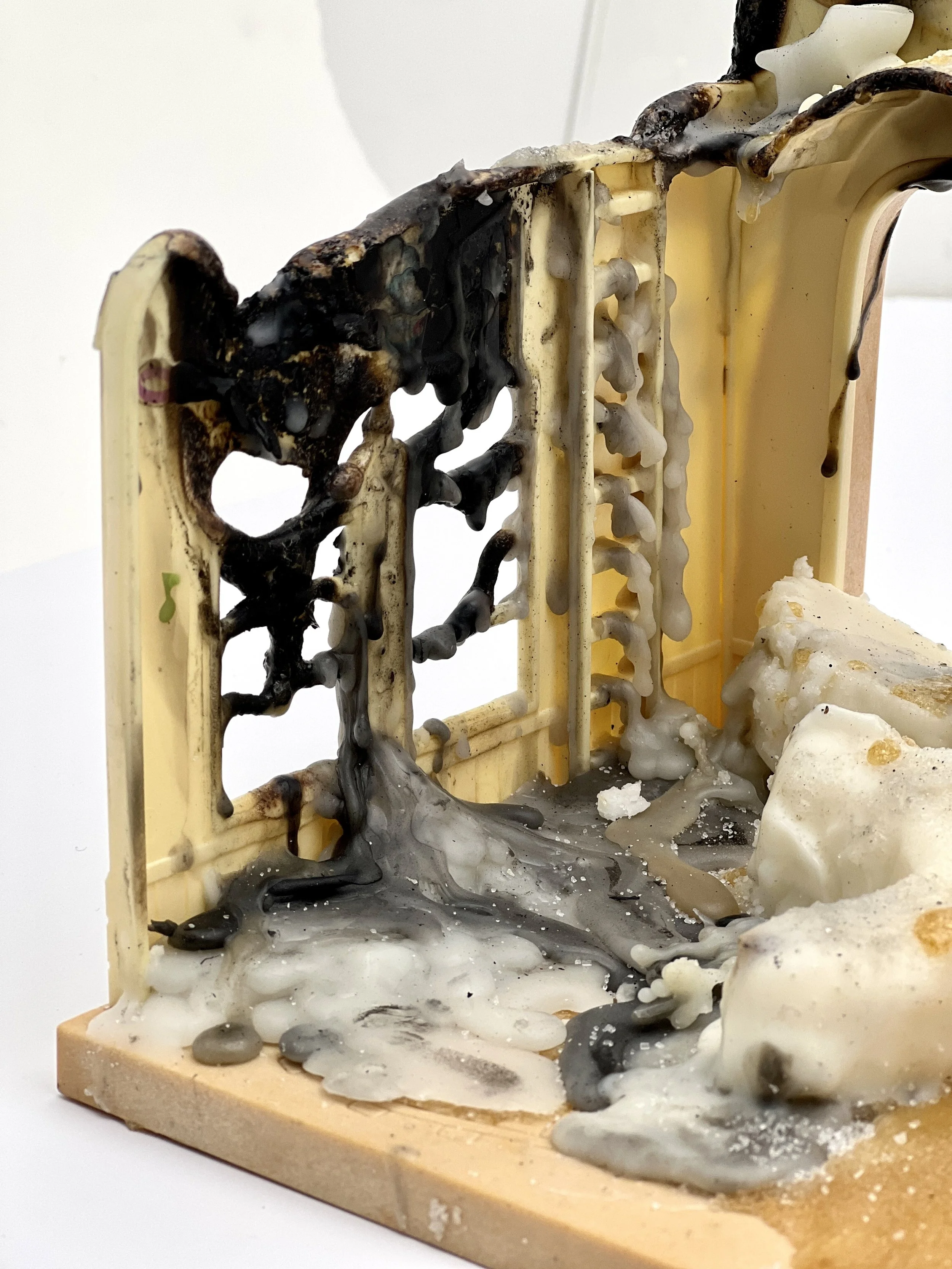 Come Back Home (close up), 21.5x29.8x21.5cm, Wax candles and sugar on a second hand dollhouse, 2023