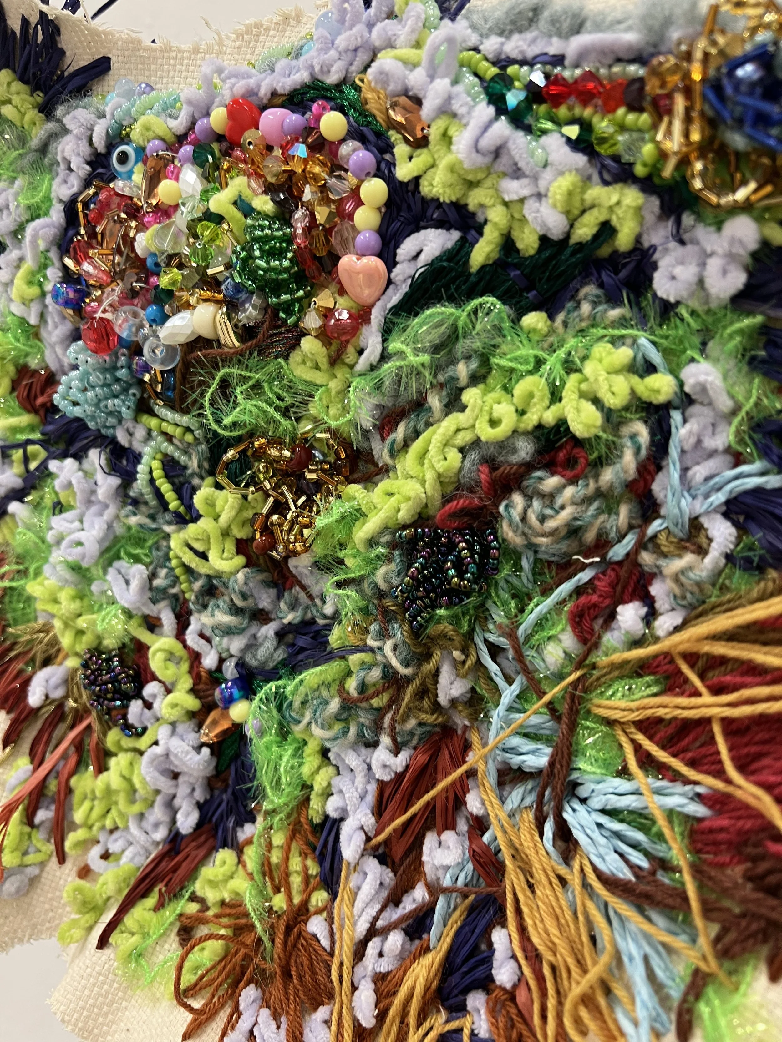Overgrowth (close up), 37x34 cm, Yarn, raffia ribbon, beads and metallic thread on monks cloth, 2022