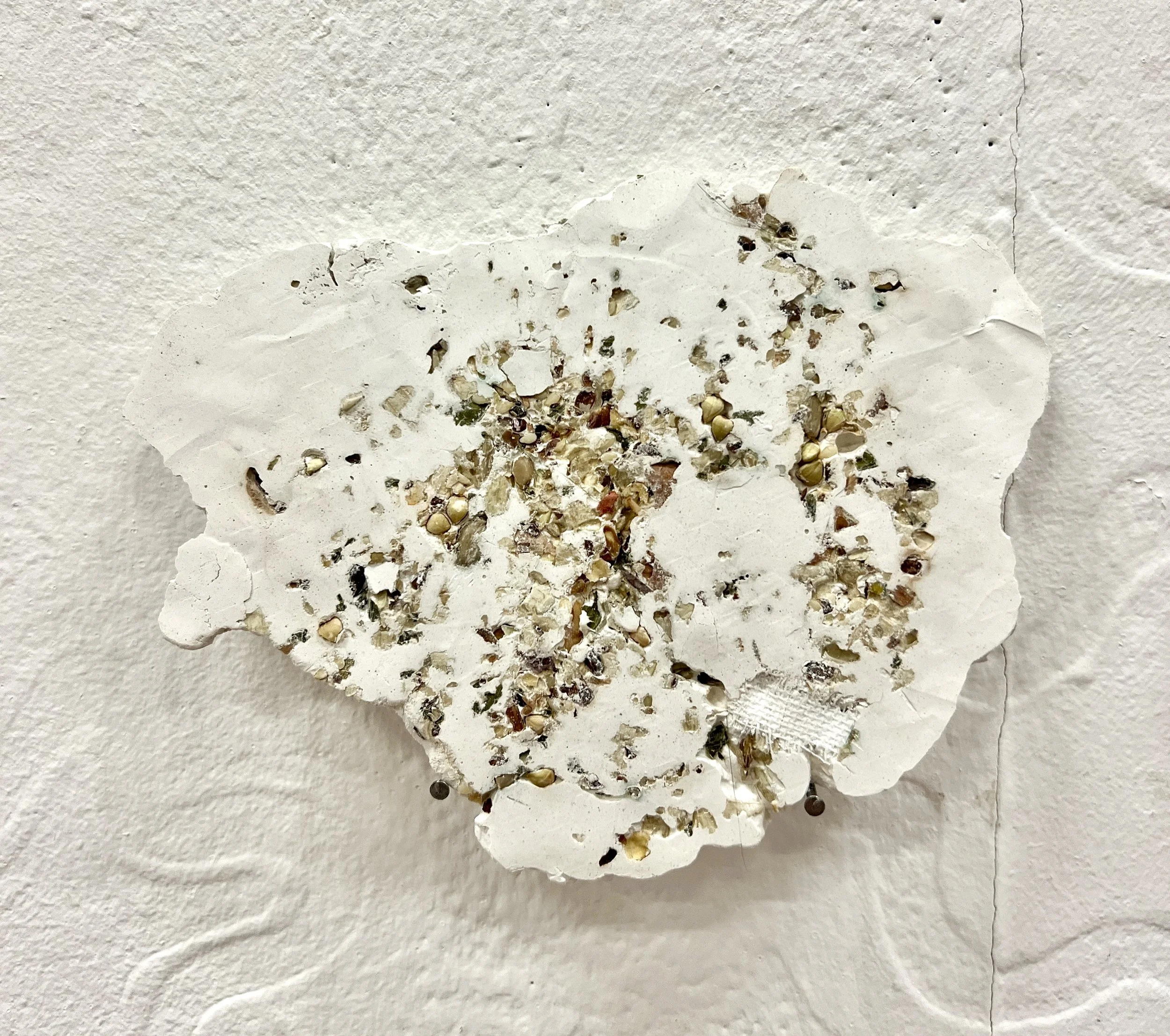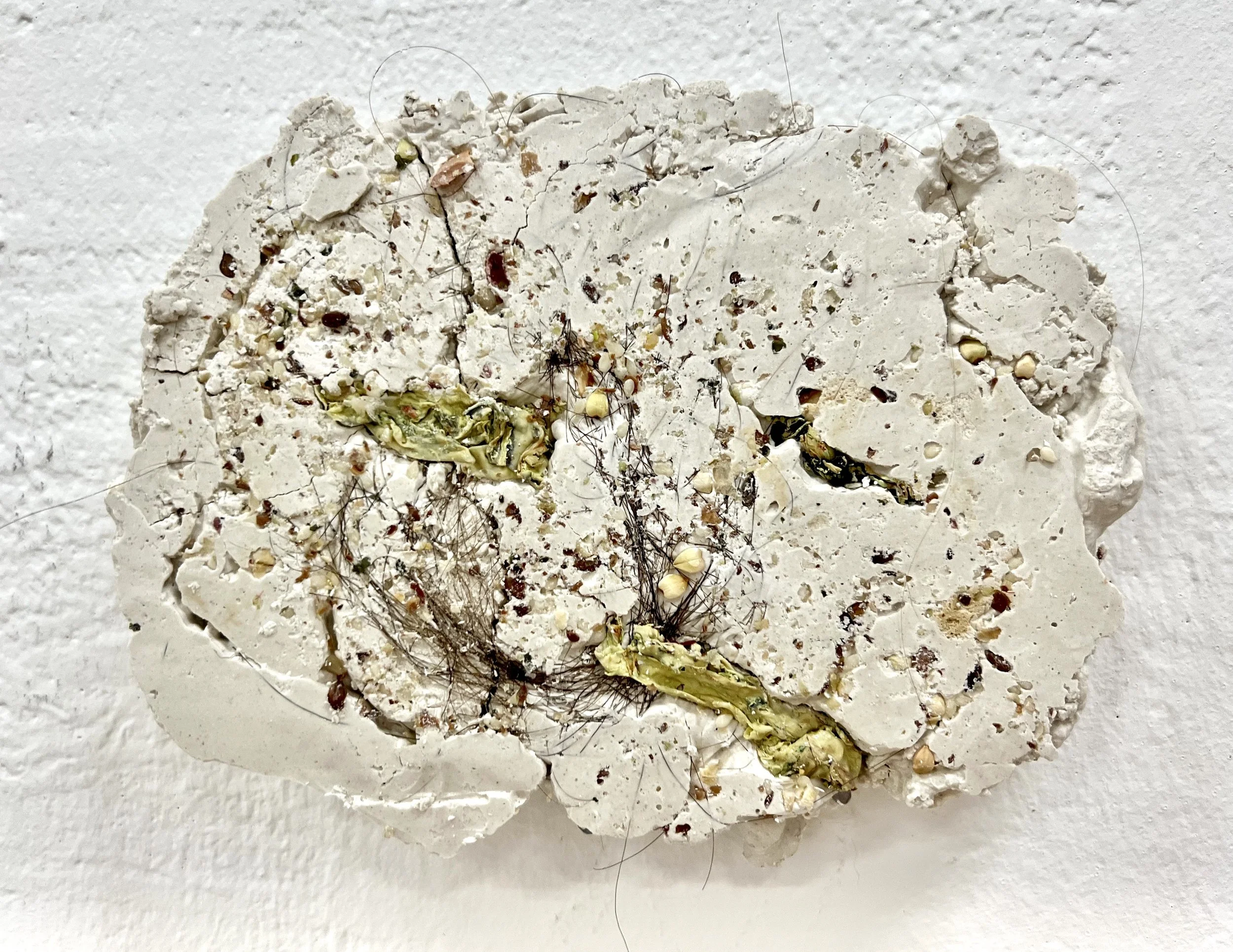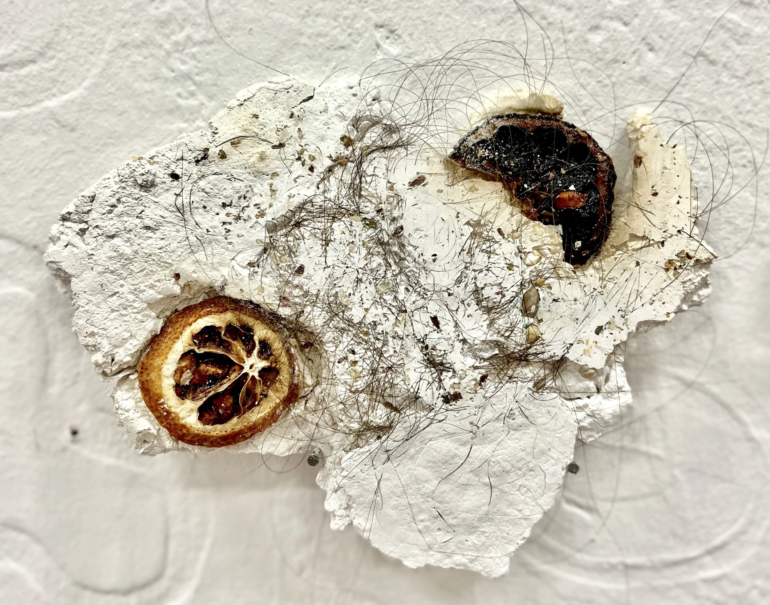 Residue Fossils (No.2), 10x15x3cm, Mixed nuts, hair, lemons and cotton pads embedded in plaster, 2023