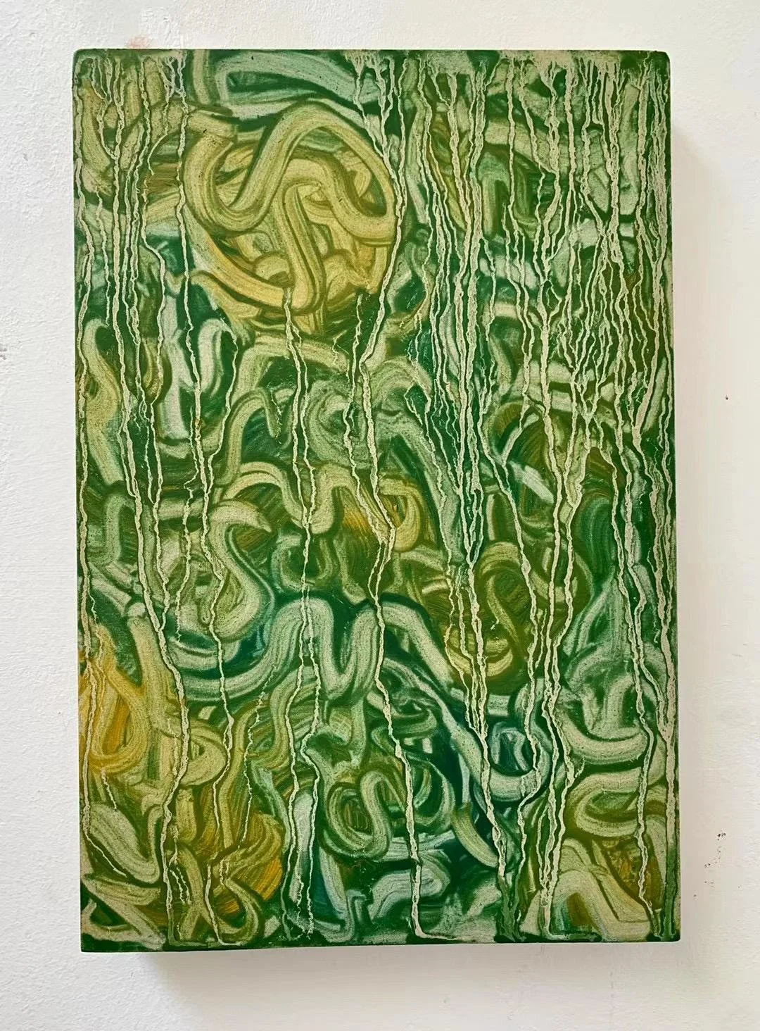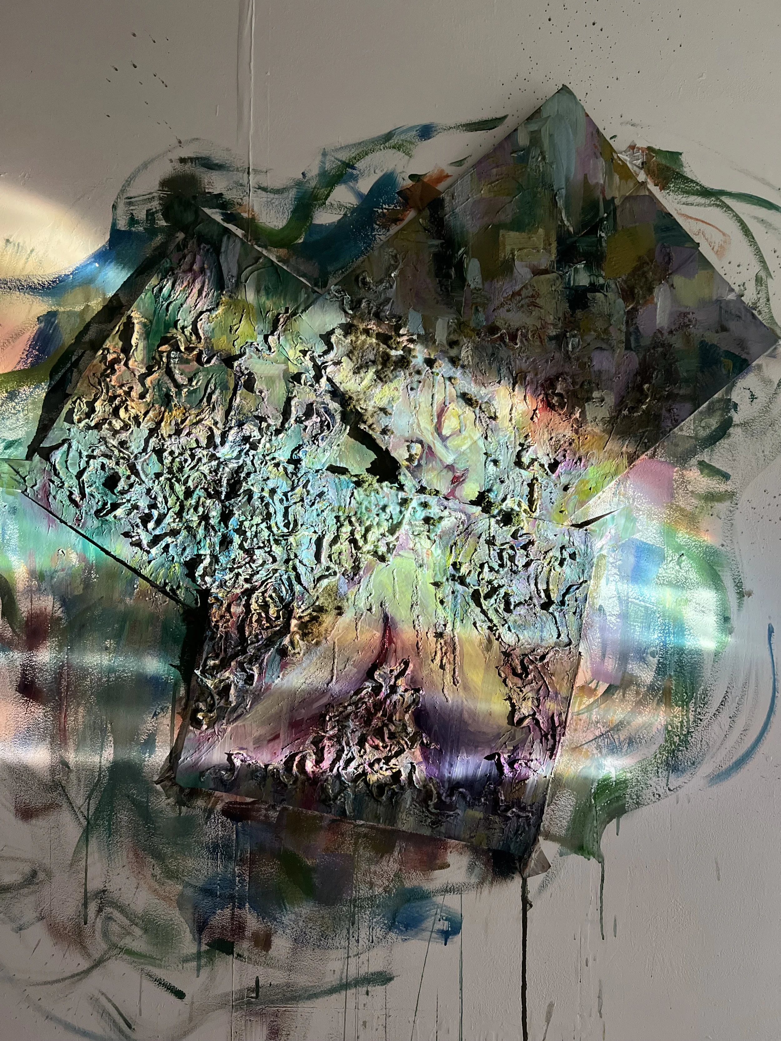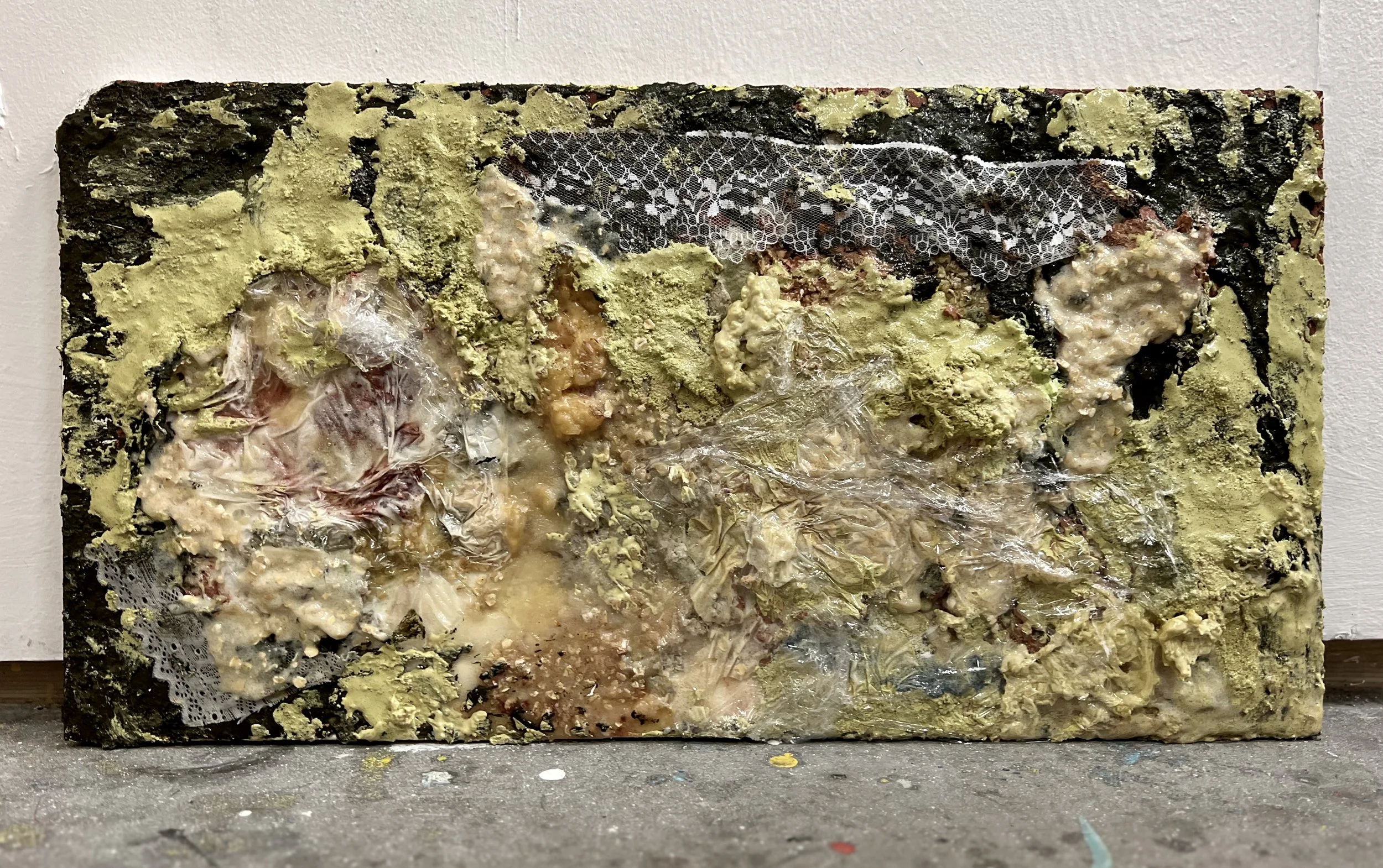 Untitled, [dimensions], Acrylic, oil, latex, lemon syrup, sugar, cling wrap and lace on wood panel, 2023
