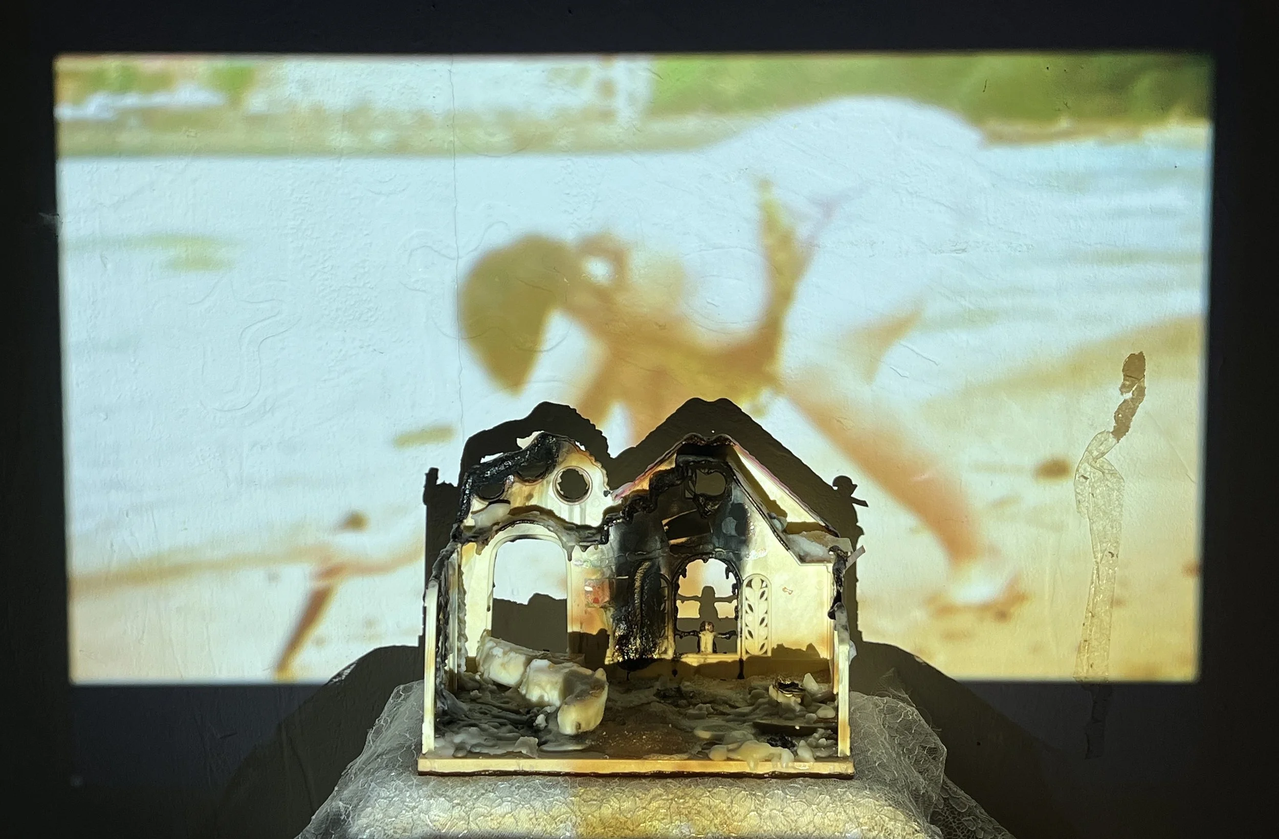 Making a Nest (projections), Projections of 'Making a Nest' video performance on 'Come Back Home' dollhouse, 2023