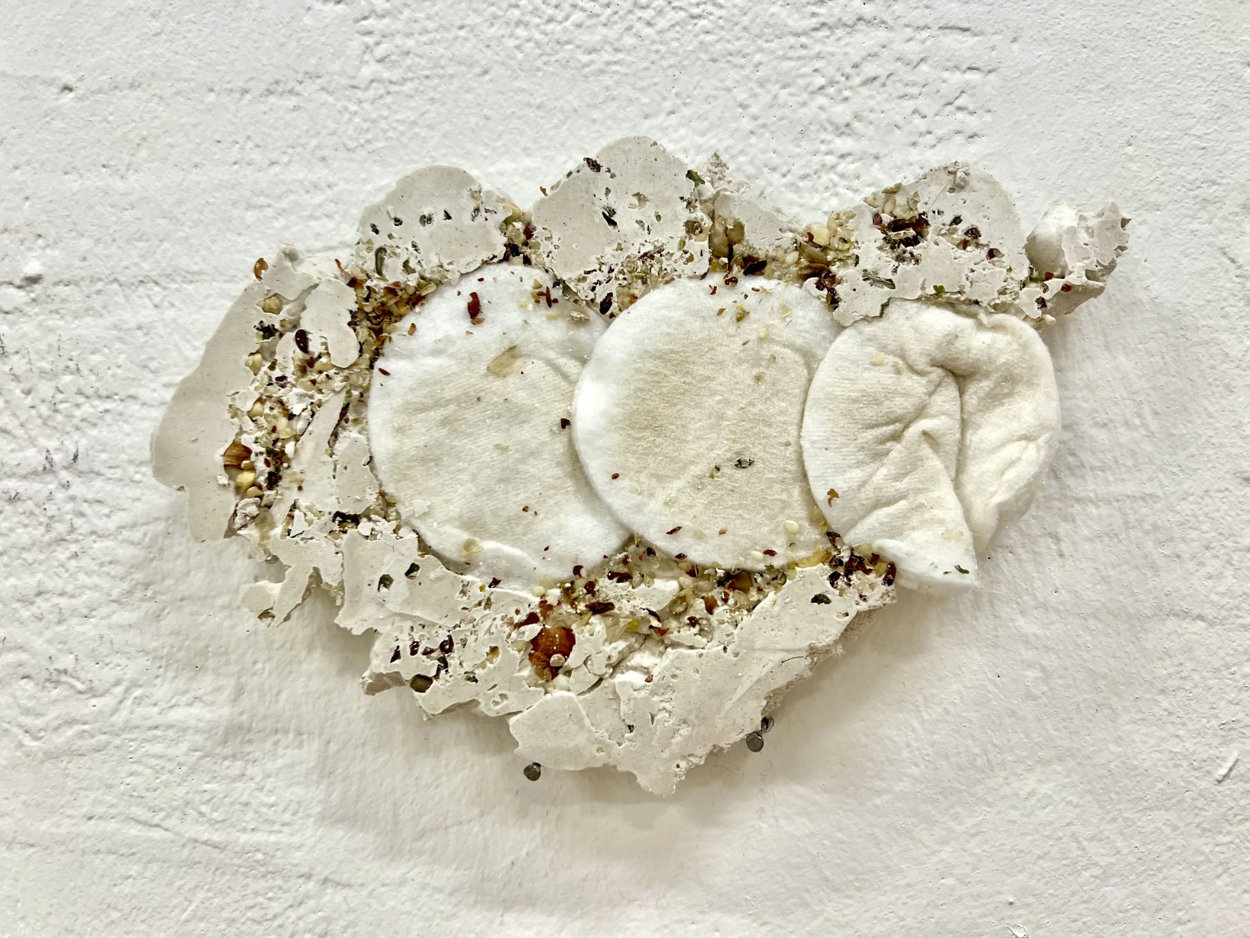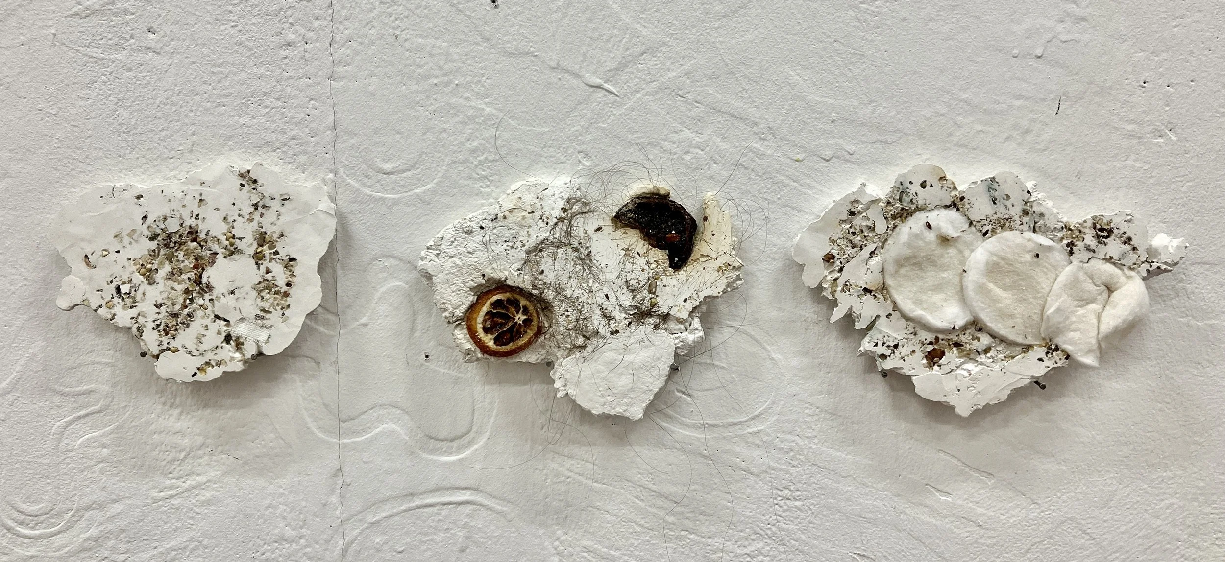 Residue Fossils (series), 10x15x3cm, Mixed nuts, hair, lemons and cotton pads embedded in plaster, 2023