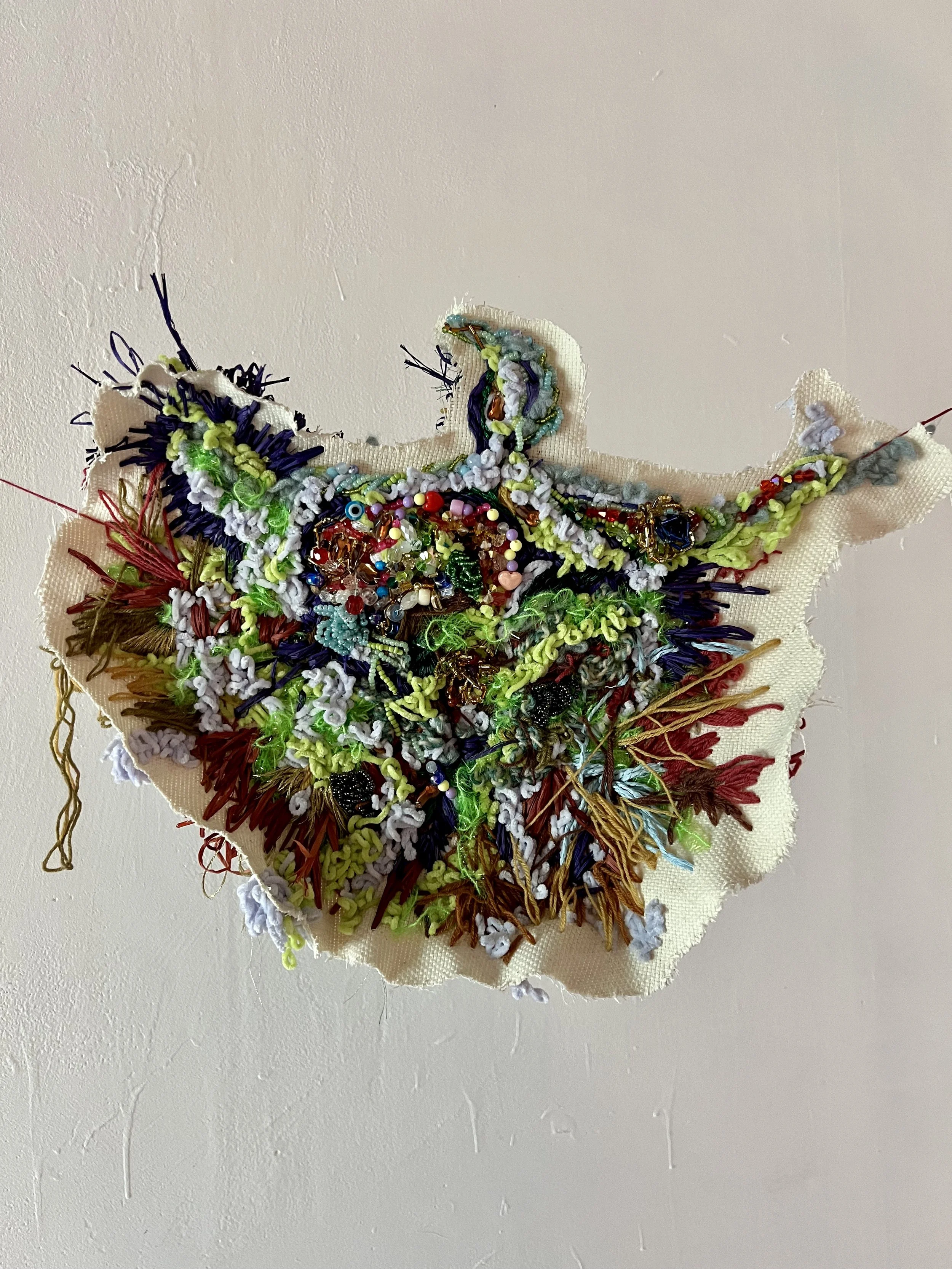 Overgrowth, 37x34 cm, Yarn, raffia ribbon, beads and metallic thread on monks cloth, 2022
