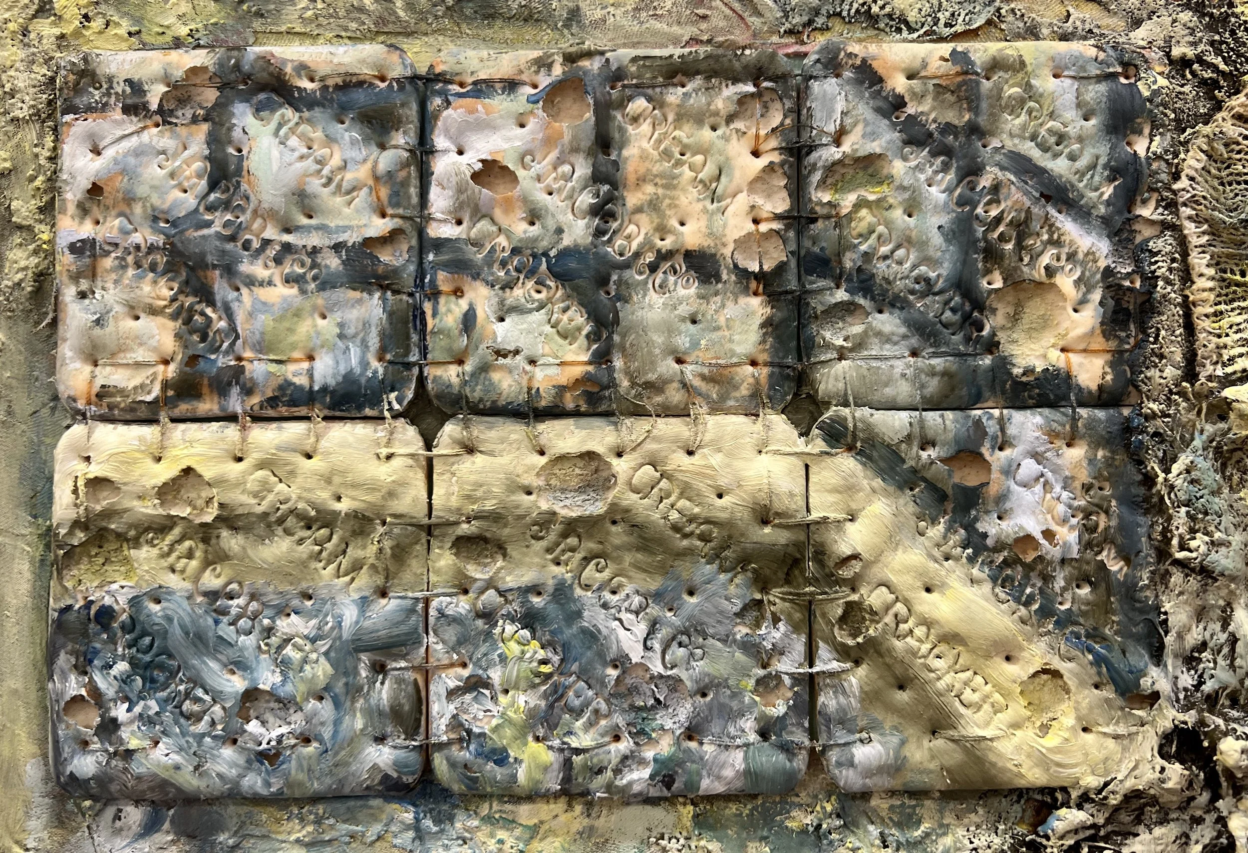 My Bathtub is Clogged, 23x32cm, Oil on latex and biscuits stitched to canvas, 2023